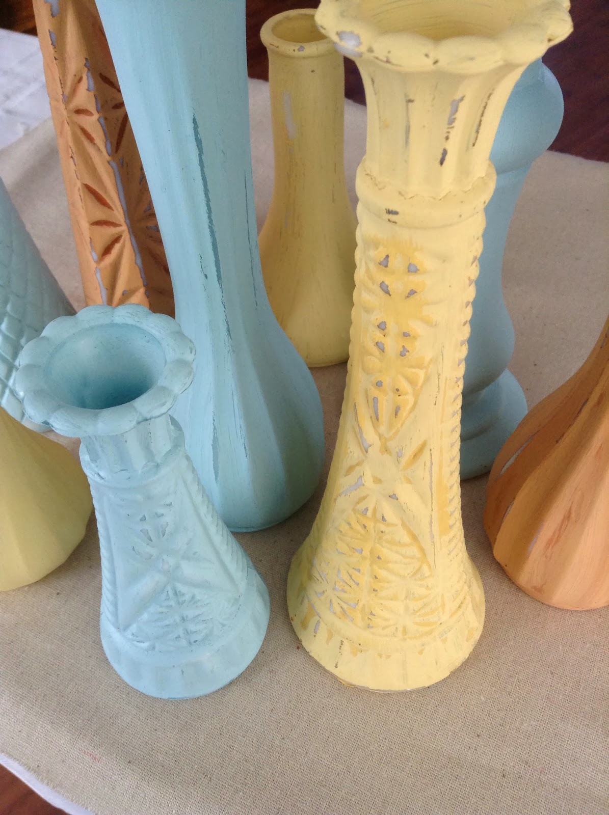 With Thanksgiving just around the corner, I thought it would be fun to do a simple painting project and add some of these softer shades of autumn to plain white vases for a pretty pastel table or mantle display. Add some lovely green or white pumpkins, a little linen or burlap maybe, and you'll have a stunning shabby chic tablescape for your Thanksgiving feast.