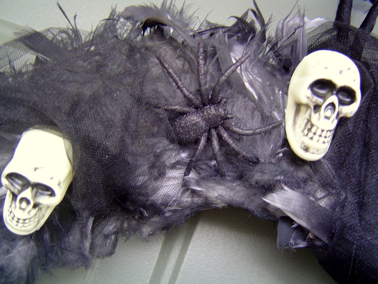 Then I hot glued on the skulls and added some black tulle I had left over from my witch costume. Then I added some left over sparkely spiders I had from my stacking pumpkins for fun!