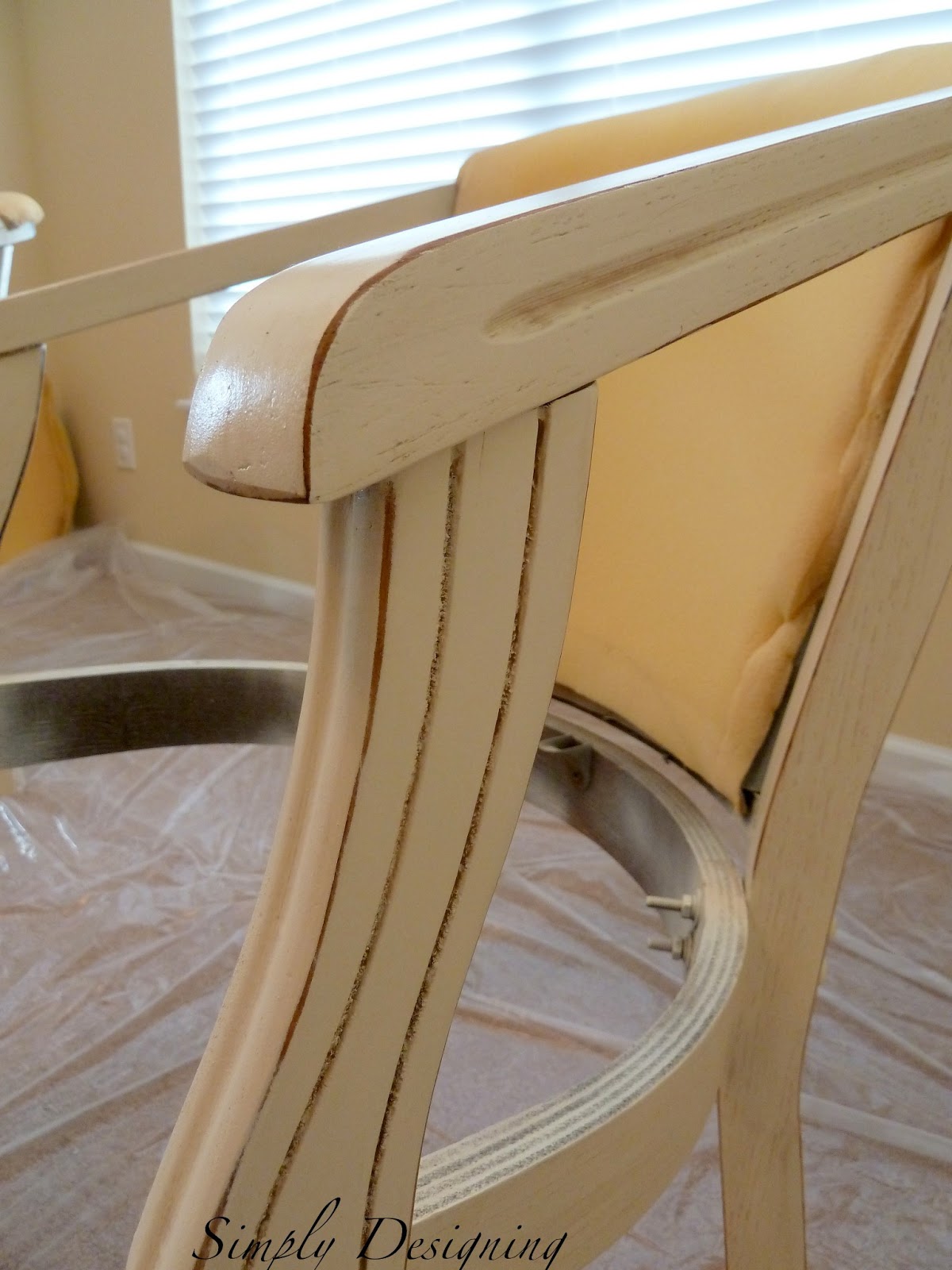 After the chairs received a couple of coats of paint and were allowed to dry completely, we took our handheld electric sander and distressed the edges up a bit. After you do this it is important to wipe down the entire chair with a tack cloth.