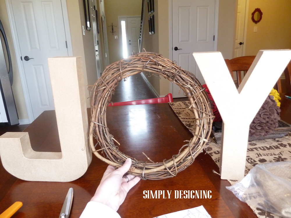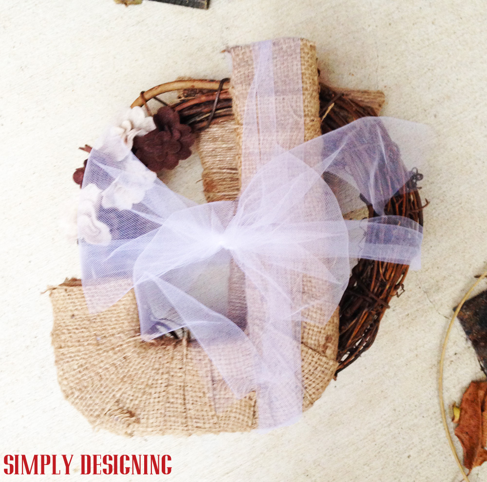 Fourth, wrap jute around a portion of your grapevine wreath and secure with hot glue.