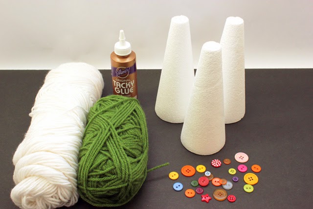 Add a tree topper - gift bows, ribbons and pom poms all work great - and decorate your tree with button and pom pom ornaments.