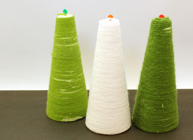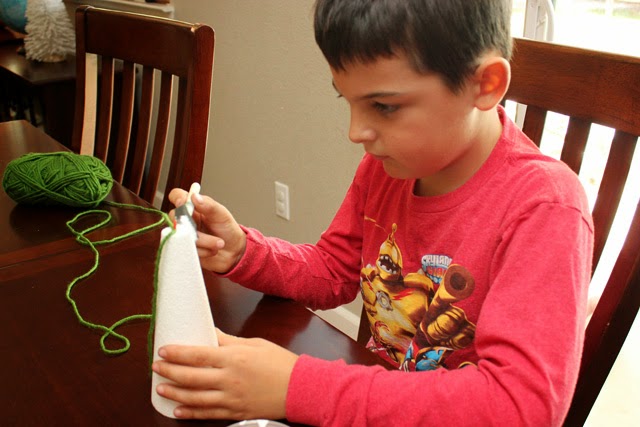 Start wrapping the yarn around the tree. Try to keep the rows of yarn neat and close together. When you reach the bottom 2" of the tree, apply another layer of glue to keep the yarn in place.