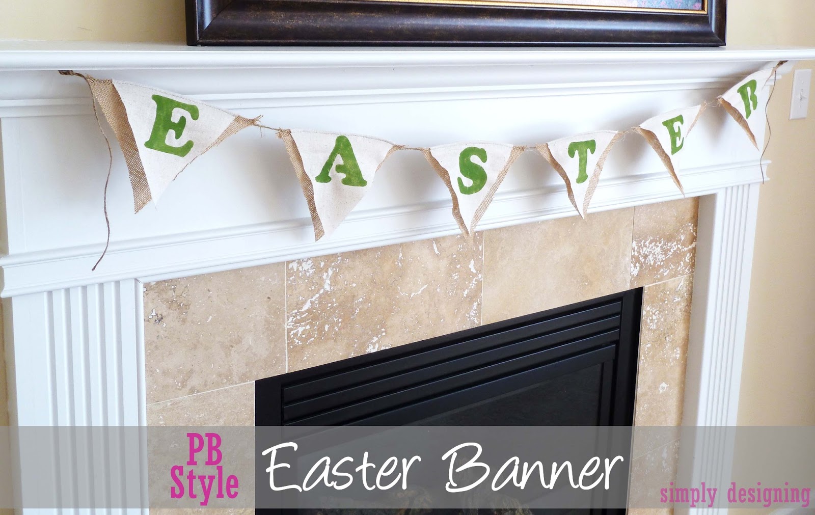 I rarely make it to the mall. It's not that I don't like to shop, but going to the mall with two young kiddos is never a lot of fun. Well the other day I needed to go there and so my son and I took a little walk around the mall. We didn't go in many stores, we window shopped and low and behold, as I walked past Pottery Barn, I saw a really cute (very breakable) Easter Display! I didn't dare take my son into the store with all the breakable items, but I admired from afar. What I loved most was a cute burlap Happy Easter Banner that I knew would look great on my mantle!