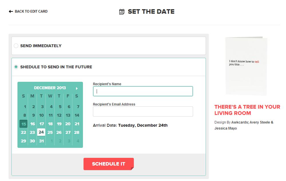You can choose to have your card delivered via email or through snail mail. And you can also pick your delivery date.