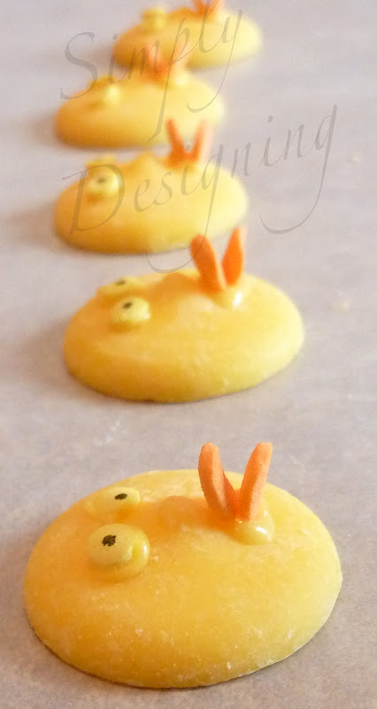 Dip one end of a pop stick into the melted chocolate and carefully press into the filling. (I forgot to take a photo when I did this with my yellow melted chocolate, so pretend the white melting chocolate is really yellow.)