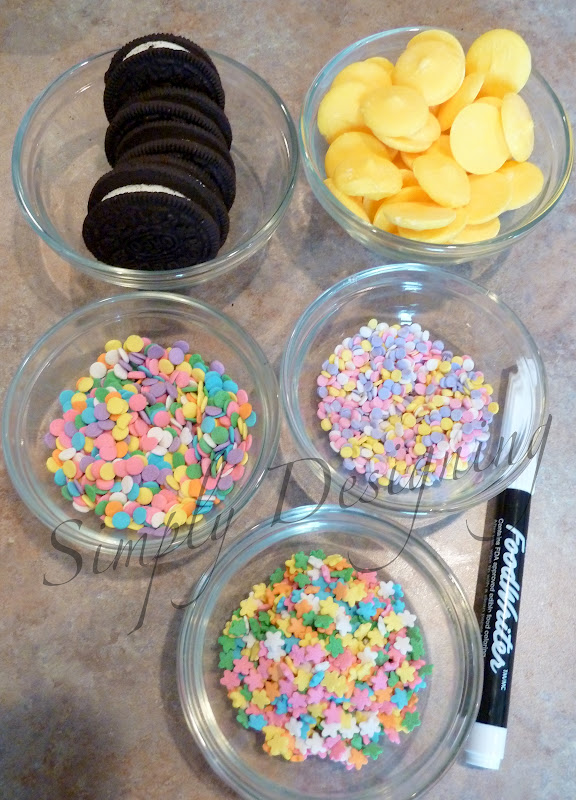 Then grab (2) orange Daisy sprinkles and (1) yellow Daisy sprinkle and attach (using chocolate on a toothpick) to your Oreo for the Chick's feet and tuft on top of it's head.