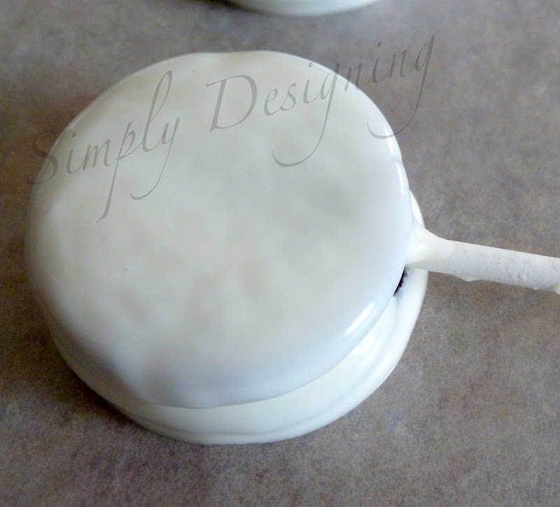 Then, you will dip the entire Oreo into your yellow melting chocolate (again, let's just pretend this chocolate is really yellow...I was doing two projects at once and forgot to snap enough photos as I was working!)
