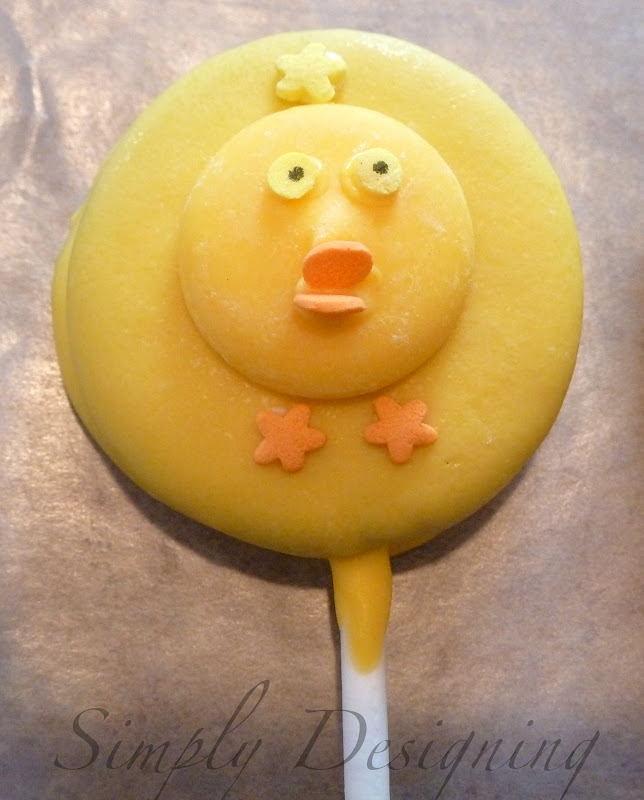 After your Oreo Pops and your Chick Faces are set, you can take a bit more chocolate and adhere the face to the Oreo.