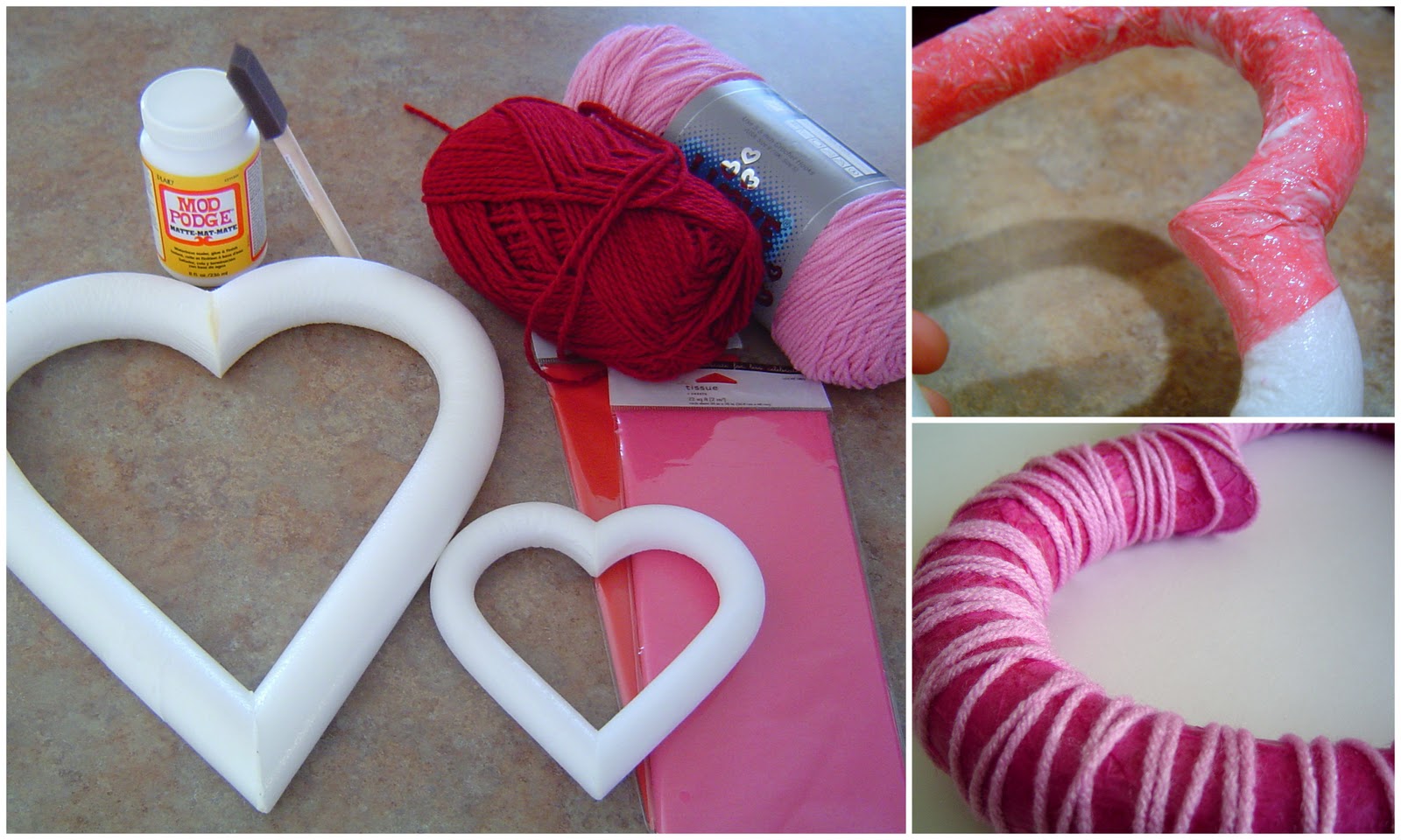6. Randomly adhere yarn on top of the heart.  You can do this two ways: a) dip pieces of yarn in the modpodge, completely coating the yarn, and wrap the yarn around the heart.  b) randomly wrap yarn around the heart and use hot glue to adhere the ends.  I did option b because I knew it would dry quicker and because I really didn't want to get my hands messy.  Lame but true 🙂